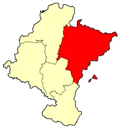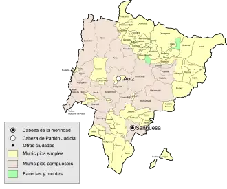 Abaurregaina, Abaurrepea, Aibar, Aoiz, Aranguren, Arce-Artzi, Aria, Aribe, Auritz, Burgui, Burlada, Cáseda, Castillo-Nuevo, Erro, Eslava, Esparza de Salazar, Esteribar, Ezcároz, Ezprogui, Gallipienzo, Gallués, Garaioa, Garde, Garralda, Güesa, Hiriberri-Villanueva de Aezkoa, Huarte-Uharte, Ibargoiti, Isaba, Izagaondoa, Izalzu, Jaurrieta, Javier , Leache, Lerga, Liédena, Lizoain-Arriasgoiti, Lónguida, Lumbier, Luzaide, Monreal, Navascués, Noáin, Ochagavía, Orbaizeta, Orbara, Orontze, Orotz-Betelu, Petilla de Aragón, Romanzado, Roncal-Erronkari, Roncevaux, Sada, Sangüesa, Sarriés, Tiebas-Muruarte de Reta, Unciti, Urraúl Alto, Urraúl Bajo, Urroz-Villa, Urzainqui, Uztárroz, Vallée d'Egüés, Vidángoz et Yesa.