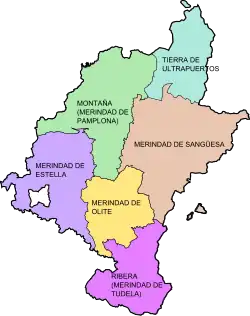 Les mérindades ont été créés au XIIIe siècle sous le règne de Thibaud II (1253-1270), en divisant le territoire du royaume de Navarre en quatre mérindades plus la terre d’Ultrapuertos qui n’est pas configurée comme telle. En 1407, sous le règne de Charles III le Noble on a créé la mérindade d'Olite, composée de localités précédemment situées à Sangüesa, Tudela et Estella. Chaque mérindade était administrée par un mérino (fonctionnaire d’armes chargé de résoudre des conflits dans ses territoires, en accomplissant des fonctions qui sont assignés actuellement aux juges). Il administrait en outre le patrimoine royal et avait une certaine fonction militaire. L’importance qu’avait chacune d’elles, dépendait de la somme de plusieurs facteurs : son activité économique comme centre artisanal et commercial, sa densité démographique, sa situation stratégique et ses châteaux et murailles[3].