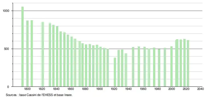 L'évolution du nombre d'habitants est connue à travers les recensements de la population effectués dans la commune depuis 1793. Pour les communes de moins de 10 000 habitants, une enquête de recensement portant sur toute la population est réalisée tous les cinq ans, les populations de référence des années intermédiaires étant quant à elles estimées par interpolation ou extrapolation[21]. Pour la commune, le premier recensement exhaustif entrant dans le cadre du nouveau dispositif a été réalisé en 2007[22].