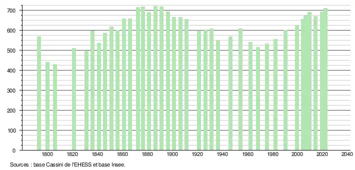 L'évolution du nombre d'habitants est connue à travers les recensements de la population effectués dans la commune depuis 1793. Pour les communes de moins de 10 000 habitants, une enquête de recensement portant sur toute la population est réalisée tous les cinq ans, les populations de référence des années intermédiaires étant quant à elles estimées par interpolation ou extrapolation[22]. Pour la commune, le premier recensement exhaustif entrant dans le cadre du nouveau dispositif a été réalisé en 2004[23].
