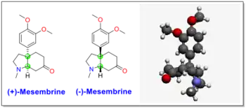 La mésembrine a d'abord été isolée et caractérisée par K. Bodendorf et W. Krieger en 1957[4]. La mésembrine est une molécule bicyclique et possède deux atomes de carbone chiraux en tête du pont entre le cycle à cinq chaînons et le cycle à six chaînons. Des contraintes stériques ne permettent l'existence que d'une paire d'énantiomères : la (+)-(3aR,7aR)-mésembrine et la (–)-(3aS,7aS)-mésembrine. Les descripteurs de chiralité aR et aS dans cette molécule ne réfèrent pas à une chiralité axiale mais correspondent au système de numérotation des atomes qui assigne un « a » aux atomes de la partie indolique de la molécule comme le montre le numéro de branchement -3a- du groupe 3,4-diméthoxyphényle sur cette partie. L'isomère lévogyre, la (−)-mésembrine, constitue la forme naturelle[5],[6]. De fait, ceci a été déterminé en 1970 en résolvant la structure cristalline du dérivé méthiodure de 6-epimésembranol qui est monoclinique, groupe d'espace P21 (no 4)[5].