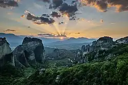Les Météores (en grec moderne : Μετέωρα) sont une formation géologique du nord de la Grèce, dans le district régional de Trikala, en Thessalie, dans la vallée du Pénée. Ils abritent des monastères chrétiens orthodoxes (en grec moderne : Μετέωρα Μοναστήρια, « monastères suspendus au ciel ») perchés au sommet de falaises et pitons rocheux gris, sculptés par l'érosion.