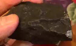 Fragment d'une tranche de Lost City (1,05 g). La croûte de fusion est visible sur le côté gauche. | |