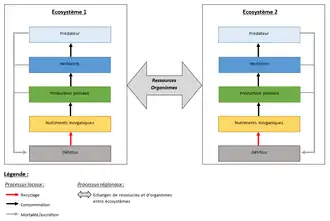 La dynamique des métaécosystèmes dépend de processus locaux et régionaux et de la façon dont ces derniers interagissent entre eux[6],[3]. Les processus locaux correspondent aux interactions trophiques (autotrophie, herbivorie, prédation) et non-trophiques (recyclage des nutriments), qui ont lieu au sein même des écosystèmes. Les processus régionaux, quant à eux, sont les flux d’organismes et de ressources reliant les différents écosystèmes entre eux[6].