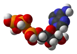 L'adénosine triphosphate (ATP) est la coenzyme universelle des échanges d'énergie chez tous les organismes connus. Ce nucléotide permet de transférer de l'énergie métabolique entre les réactions qui libèrent de l'énergie et celles qui en absorbent. Il n'y a à chaque instant qu'une faible quantité d'ATP dans les cellules, mais, comme ce capital d'ATP est continuellement consommé et régénéré, le corps humain peut en réalité consommer chaque jour une masse d'ATP pratiquement équivalente à son poids total[25]. L'ATP permet de coupler l'anabolisme au catabolisme, le premier consommant l'ATP produit par le second. Il sert également de transporteur de groupes phosphate dans les réactions de phosphorylation.