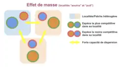 - L’effet de masse, où l’on retrouve un flux net d’individus créé par des différences de tailles (ou de densité) de populations dans différentes parcelles;