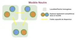 Dans ce cas, toutes les espèces sont similaires dans leurs capacités compétitrices, leurs mouvements et leurs formes physiques. Sans spéciation ni immigration, le modèle neutre conduit à l’extinction de toutes les espèces. Ainsi, contrairement aux autres points de vue décrits ci-dessus, ce modèle ne peut expliquer comment la diversité locale et régionale diffère sans faire appel à d’autres processus. Par conséquent, la dynamique de diversité des espèces est dérivée à la fois des probabilités de perte d’espèces (extinction, émigration) et de gain d’espèces (immigration, spéciation).