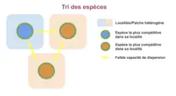Dans cet exemple, l’espèce orange comme l’espèce bleue sont principalement présentes dans les localités au sein desquelles elles sont meilleures compétitrices. Elles sont également présentes dans les localités où l’autre espèce est meilleure compétitrice, grâce à la dispersion.