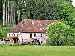 - Moulin de Cubolot sur la Sarre rouge avec sa roue à aubes en dessous[20].