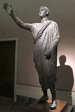 - Détail du plissé de la toge et de la main gauche de l'Arringatore.