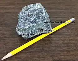Le faciès éclogite est généralement rencontré entre 80 et 100 km de profondeur et se caractérise par la présence de pyroxène omphacitique vert et du grenat pyrope rouge[12]. Le pyroxène omphacitique est une solution solide d'augite-jadéite. Aux conditions du faciès éclogite, le plagioclase n'est plus stable. La décomposition du glaucophane est une réaction significative qui produit de l'eau à environ 600 °C et plus de 1 GPa, pouvant déclencher une fusion substantielle du manteau et un volcanisme[10].