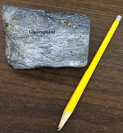 Le faciès des schistes bleus se caractérise par la formation d'une amphibole bleue sodique, à savoir la glaucophane, qui donne son nom à ce faciès. La lawsonite est également un indicateur du faciès des schistes bleus et coexiste souvent avec la glaucophane[21]. L'albite se décompose au cours des réactions produisant du glaucophane et son sodium s'incorpore dans ce dernier. Ces réactions sont importantes car elles peuvent libérer de l'eau ou produire une phase minérale hydratée, la lawsonite, par la décomposition des phyllosilicates hydratés. Aux pressions élevées de ce faciès métamorphique, l'albite peut se décomposer pour former de la jadéite et du quartz. La calcite se pseudomorphose généralement en aragonite dans les conditions du schiste bleu. Les autres minéraux courants des métabasites du faciès des schistes bleus comprennent la paragonite, la chlorite, la titanite, le stilpnomélane, le quartz, l'albite, la séricite et la pumpellyite.