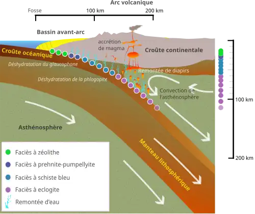 Un faciès métamorphique se définit par une association minérale stable particulière à une plage de pression et de température spécifique, ainsi qu'à un matériau initial déterminé. Dans le contexte du métamorphisme de la zone de subduction, on observe un trajet métamorphique à basse température et à haute pression, traversant les zones stables des faciès de zéolithe, de prehnite-pumpellyite, de schiste bleu et d'éclogite au sein de la croûte océanique subductée[8]. Les assemblages de faciès zéolite et préhnite-pumpellyite peuvent être présents ou absents, de sorte que le début du métamorphisme peut être caractérisé uniquement par des conditions de faciès schiste bleu[9]. Les plaques subductrices sont constituées de croûte basaltique surmontée de sédiments pélagiques[10]. Cependant, les sédiments pélagiques peuvent s'accumuler sur la paroi suspendue à l'avant-arc et échapper à la subduction[11]. La plupart des transitions de phase métamorphiques qui se produisent dans la dalle subductrice sont provoquées par la déshydratation des phases minérales hydratées. La dégradation des phases minérales hydratées se produit généralement à des profondeurs supérieures à 10 km[12]. Chacun de ces faciès métamorphiques est caractérisé par la présence d'un assemblage minéral stable spécifique, enregistrant les conditions métamorphiques subies par la dalle subductrice. Les transitions entre les faciès résultent de la déshydratation des minéraux hydratés dans des conditions spécifiques de pression et de température, et peuvent donc être attribuées à des événements de fusion dans le manteau sous un arc volcanique.