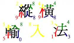 1. L'ordre de codage : le codage commence au coin haut gauche, puis au coin haut droite, ensuite au coin bas gauche et finalement au coin bas droite. Un exemple : le code CKC pour le caractère "的" est 0760.