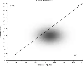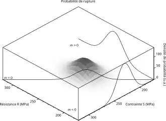 On peut tracer la surface y = ƒS׃R, ainsi que la ligne de séparation m = 0 : cette ligne marque l'état limite entre la situation de survie et la situation de défaillance. Une méthode simple d'estimer la probabilité P(m ≤ 0) consiste à utiliser une méthode de Monte-Carlo : on effectue N tirages aléatoires de couples (R, S), et l'on dénombre les n situations pour lesquelles m ≤ 0 :