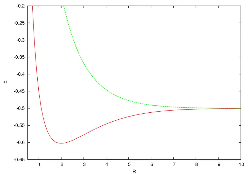où est un élément de surface différentiel dans le plan. Nous avons obtenu la formule de Holstein et Herring. Par ce dernier, Herring fut le premier à montrer[3] que le premier terme du développement asymptotique de la différence d'énergie des deux états les plus bas, c'est-à-dire le premier état quantique excité et l'état fondamental (voir le graphe pour les courbes d'énergies), était :
