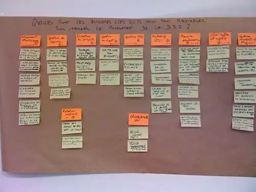 - Les cartes sont mélangées ou battues, puis lues avec soin. - Puis les cartes sont triées et regroupées quand elles semblent appartenir au même groupe d'informations. Le cluster ainsi formé reçoit un nom que l'on écrit sur une carte de couleur différente que l'on place sur le cluster. - Ce processus de constitution de groupes devra être répété jusqu'à avoir 9 clusters au maximum.