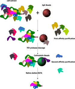 La première étape consiste à incuber l'échantillon avec des billes d'immunoglobulines de type G (IgG) qui vont lier la protéine A. Une protase TEV est utilisée ensuite pour détacher la protéine d'intérêt.