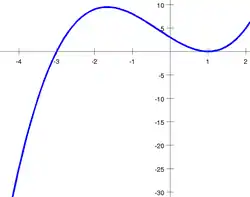 - Dans la troisième itération, on utilise une IQI entre (a2; f(a2)) = (−4; −25) et (b1; f(b1)) = (1,23256; 0,22891) et (b2; f(b2)) = (1,14205; 0,083582), ce qui donne 1,09032. Cette valeur est entre (3a2 + b2) / 4 et b2;mais la condition supplémentaire de Brent bloque: en effet, l'inégalité |1,09032 − b2| ≤ |b1 − b0| / 2 n'est pas vérifiée: la valeur en cours est donc rejetée. À la place, on calcule le point milieu de l'intervalle [a2; b2]: m = −1,42897. On a f(m) = 9,26891; on pose alors a3 = a2 et b3 = −1,42897;