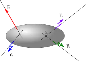 On peut donc considérer que l'on a un objet soumis à deux forces. Ces forces sont donc colinéaires (voir Diagramme de forces > Système mécanique soumis à deux forces), on sait donc que et ont pour direction la droite (I12I34). Puisque l'on connaît et que l'on connaît les directions de et de , on peut déterminer entièrement et à l'aide d'un dynamique (on connaît un des côtés du triangle et les directions des deux autres côtés).