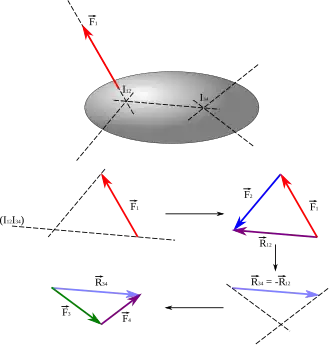 La méthode consiste à regrouper les forces deux à deux, les deux forces d'un groupe n'étant pas parallèles. On travaille alors avec la résultante de chaque groupe de force : on se ramène alors à un problème à deux forces d'une part (pour les résultantes), et à un problème à trois forces d'autre part (pour chaque couple et sa résultante).