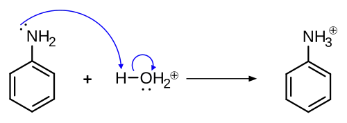 On ajoute à la solution 1,2 équivalent d'anhydride acétique, puis 1,2 équivalent d'acétate de sodium. L'aniline est le meilleur des nucléophiles présents (meilleur que l'eau et l'acétate), mais sa forme anilium, qui ne possède pas de doublet non-liant, est elle incapable d'attaquer l'anhydride. C'est ici le rôle de l'acétate, qui va déprotonner partiellement l'anilum en aniline et lui permettre d'attaquer l'anhydride. Cette réaction acide-base est limitée, l'hydrochlorure d'anilium ayant à peu près le même pKA que l'acide acétique (environ 4,7), mais elle va produire une source continue d'aniline, d'autant plus facilement que l'aniline ainsi produite va réagir avec l'anhydride :