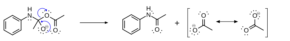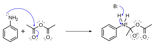 L'aniline s'additionne ainsi, l'anhydride formant un intermédiaire tétraédrique qui va être déprotoné, aidé en cela par la présence de base (l'acétate de sodium). Le second groupe acétate de l'anhydride sert enfin de groupe partant, formant l'amide final :