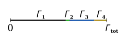 - On choisit un deuxième nombre aléatoire U' uniformément réparti entre 0 et Γtot qui va servir à tirer au hasard l'état final de la transition (voir la figure ci-contre).