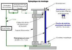 On utilise une éprouvette ayant la forme d'une poutre, composée d'une tôle support (généralement en acier) connue qui est revêtue sur une face d'un échantillon de matériau amortissant (ou viscoélastique) à tester. Cette poutre composite est fixée sur un support en acier inoxydable amagnétique par un système à simple encastrement, cas le plus courant.