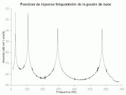En comparaison avec le spectre de la poutre de base, la forme de la courbe autour de chaque mode a changé (élargissement des pics) car le facteur de perte d'une poutre composite est typiquement cent fois supérieur à celui de l'acier.