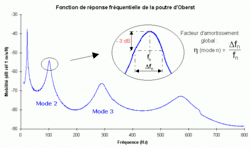 Dans le cas d'une poutre composite (c'est-à-dire tôle support avec matériau), l'analyse spectrale de fréquences propres en flexion permet de déterminer directement la valeur du facteur d'amortissement global (ou « valeur de Oberst »), à une température donnée. Pour cela, on utilise la méthode de la largeur de la bande de fréquence à −3 dB de la valeur maximale d'un pic de résonance.