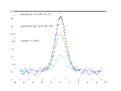 Pour simuler la forme de chaque pic, on peut recourir à une fonction mathématique a priori, sans signification particulière, par exemple une fonction gaussienne, lorentzienne, ou mieux une pseudo fonction de Voigt ou une fonction de Pearson VII, et affiner sa largeur à mi-hauteur H (FWHM, Full Width at Half Maximum en anglais). On a donc autant de largeurs à affiner que de pics.