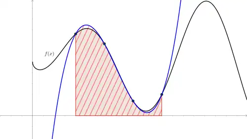 Un polynôme étant une fonction très facile à intégrer, on approche l'intégrale de la fonction f sur l'intervalle [a, b], par l'intégrale de P sur ce même intervalle. On a ainsi la simple formule :