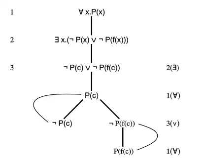 Pour que la méthode soit complète, il est parfois nécessaire d'appliquer la règle plusieurs fois, en instanciant par des termes différents. Le tableau suivant montre que l'ensemble de formules est insatisfiable. Dans la colonne de droite sont indiqués le numéro de la formule et le connecteur décomposés pour obtenir les formules au niveau correspondant.