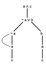 Ce tableau ne peut être fermé, donc l'ensemble de départ est satisfiable. En particulier, il est satisfait dans le modèle où sont interprétées par vrai, comme le montre la branche de droite qui ne peut être fermée.