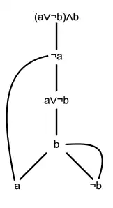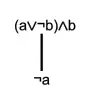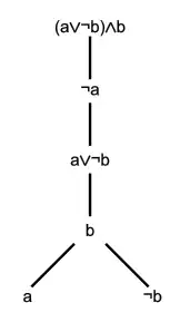 On veut montrer que est une conséquence de en logique classique propositionnelle. Par réfutation, il s'agit donc de montrer que est insatisfiable. On démarre donc avec le tableau :