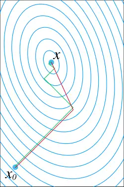 Ceci suggère donc de prendre la première direction p1 comme l'opposé du gradient de f à x=x0. Le gradient vaut Ax0 – b= – b, d'après notre première hypothèse. Les vecteurs suivants de la base seront ainsi conjugués au gradient, d'où le nom « méthode du gradient conjugué ».