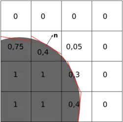 - la méthode PLIC (Piecewise linear interface calculation) basée sur la connaissance de la pente locale mais constituant une interface discontinue (voir figure ci-dessus).