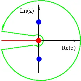 On utilise alors le contour du "trou de serrure", formé d'un petit cercle ouvert de rayon ε, s'étendant sur un segment parallèle au demi-axe jusqu'à un autre cercle ouvert.
