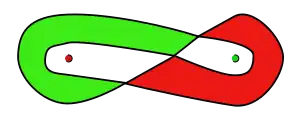 Par sa construction, la courbe est homologue à 0 mais pas homotopique à 0. Son indice autour de tout point est de 0 malgré le fait qu'à l'intérieur le plan doublement épointé il ne peut pas être réduit à un seul point.