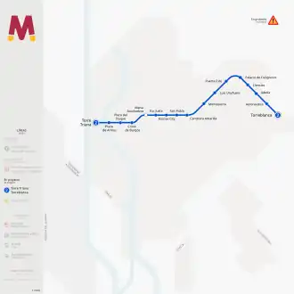 Concernant la section sud, son tracé est redéfini en , notamment pour desservir l'hôpital Virgen del Valme, situé tout au sud de Séville[29]. Le marché de mise à jour du plan d'exécution est attribué en [30]. Alors qu'il accuse déjà plus d'un an de retard, le gouvernement régional et la municipalité annoncent en un nouveau décalage de trois mois afin d'étudier un tracé alternatif dans le quartier de Bellavista[31].
