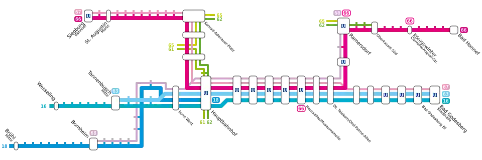 | 66 | „Telekom-Express“ Siegburg – Siegburger Bahn – Bonn Hbf – Stammstrecke – Südbrücke – Ramersdorf – Siebengebirgsbahn – Königswinter – Bad Honnef | 30,0 km 15,0 km dans Bonn | 31,0 km/h 31,0 km/h dans Bonn |
