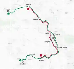 Le réseau utilise quinze rames Urbos III de Construcciones y Auxiliar de Ferrocarriles (CAF) qui circulent à une vitesse moyenne de 20 km/h[17]. Huit rames supplémentaires sont commandées en , pour une mise en service en [19]. Les trois premières unités supplémentaires sont réceptionnées en [20]. et mises en service un an plus tard[21]. Trois nouveaux trains sont mis en service en [22].