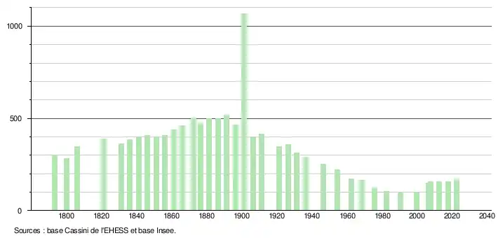 L'évolution du nombre d'habitants est connue à travers les recensements de la population effectués dans la commune depuis 1793. Pour les communes de moins de 10 000 habitants, une enquête de recensement portant sur toute la population est réalisée tous les cinq ans, les populations de référence des années intermédiaires étant quant à elles estimées par interpolation ou extrapolation[23]. Pour la commune, le premier recensement exhaustif entrant dans le cadre du nouveau dispositif a été réalisé en 2007[24].