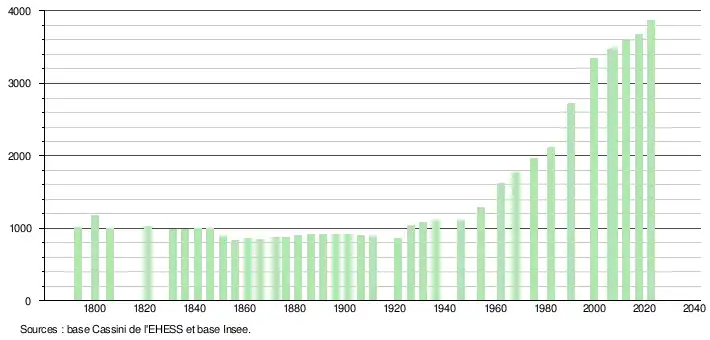 L'évolution du nombre d'habitants est connue à travers les recensements de la population effectués dans la commune depuis 1793. Pour les communes de moins de 10 000 habitants, une enquête de recensement portant sur toute la population est réalisée tous les cinq ans, les populations de référence des années intermédiaires étant quant à elles estimées par interpolation ou extrapolation[20]. Pour la commune, le premier recensement exhaustif entrant dans le cadre du nouveau dispositif a été réalisé en 2007[21].