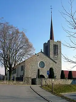 L'église Saint-Pierre-aux-liens (1937-1939), due à l'architecte Fernand Dumas, est l'une des constructions majeures du Groupe de Saint-Luc et témoin de ses ambitions de renouveau de l'art sacré[5]. L'architecte y a prévu l'emploi quasi-exclusif du verre pour l'agencement intérieur. Les autels, table de communion, chaire et lustres ont été réalisés par l'atelier Labouret, à Paris, inventeur, avec les verriers François Décorchemont et Félix Gaudin, de la dalle de verre (1928). Le chœur de l'église est orné d'une vaste composition d'Emilio Maria Beretta qui couvre le mur entier du chevet plat. Cette peinture sous verre met en scène la délivrance de saint Pierre par un ange qui le fait sortir de prison. Les vitraux non figuratifs ont été imaginés par Yoki (alias Émile Aebischer) et réalisés en collaboration avec le verrier Michel Eltschinger. Ils mettent en œuvre deux techniques différentes : la rose de la tribune (1969) est en dalle de verre, tandis que les vitraux de la nef sont en résille de plomb, de largeur variable (1979)[6].