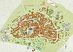 Le bourg est délimité par une enceinte circulaire. Les limites de la ville sont repoussées aux XIIIe et XVe siècles, démontrant un essor considérable. La « Porte Anglaise » est le témoin de ces fortifications en taille de pierre[23].