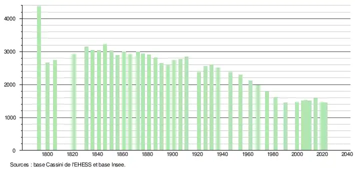 L'évolution du nombre d'habitants est connue à travers les recensements de la population effectués dans la commune depuis 1793. Pour les communes de moins de 10 000 habitants, une enquête de recensement portant sur toute la population est réalisée tous les cinq ans, les populations de référence des années intermédiaires étant quant à elles estimées par interpolation ou extrapolation[30]. Pour la commune, le premier recensement exhaustif entrant dans le cadre du nouveau dispositif a été réalisé en 2004[31].