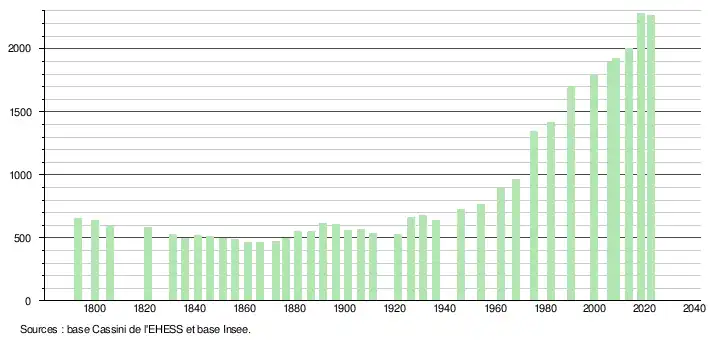 L'évolution du nombre d'habitants est connue à travers les recensements de la population effectués dans la commune depuis 1793. Pour les communes de moins de 10 000 habitants, une enquête de recensement portant sur toute la population est réalisée tous les cinq ans, les populations de référence des années intermédiaires étant quant à elles estimées par interpolation ou extrapolation[21]. Pour la commune, le premier recensement exhaustif entrant dans le cadre du nouveau dispositif a été réalisé en 2008[22].