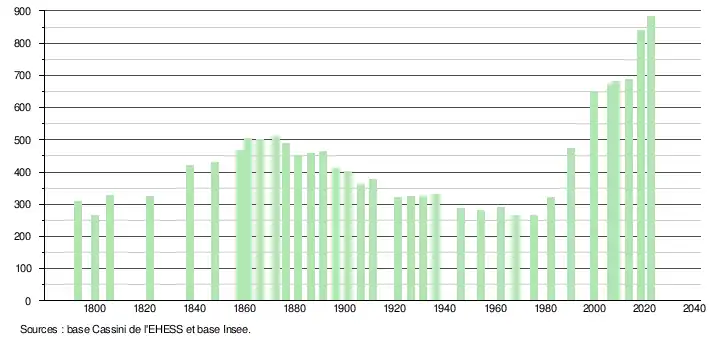 L'évolution du nombre d'habitants est connue à travers les recensements de la population effectués dans la commune depuis 1793. Pour les communes de moins de 10 000 habitants, une enquête de recensement portant sur toute la population est réalisée tous les cinq ans, les populations de référence des années intermédiaires étant quant à elles estimées par interpolation ou extrapolation[11]. Pour la commune, le premier recensement exhaustif entrant dans le cadre du nouveau dispositif a été réalisé en 2008[12].